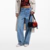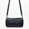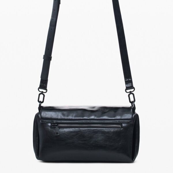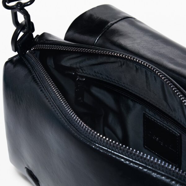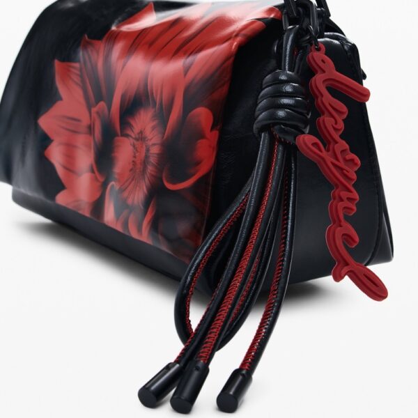 Műbőr hatású, egyszínű, keresztpántos táska fényes felülettel, nagy virágmintával, fedéllel, cserélhető fogantyúkkal és levehető kulcstartóval.
